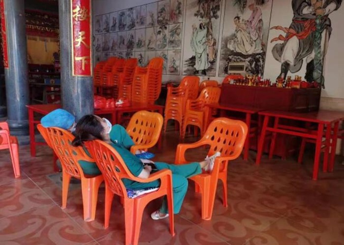 一夜奮戰,為了能更好的完成任務,他們在現場只是短暫的休息,精疲力盡的醫護人員們躺在簡易的凳子上休憩的畫面讓人久久難忘,以天為被,以凳子為床,穿著防護服,戴防護面罩及手套,雖然是秋天,福建的天氣也是非常悶,汗水早已浸透他們的衣裳。有的醫生奮戰一天一夜,早已體力透支,卻仍不愿離開現場去補眠,為莆田人民群眾的健康保駕護航。